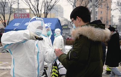 1月24日,在北京市海淀区中关村街道临时核酸检测采样点,工作人员录入被采样人员信息。