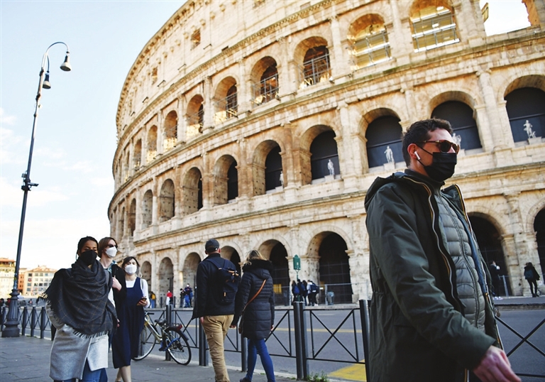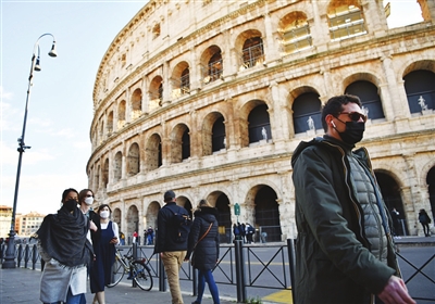 1月24日,人们佩戴口罩走过意大利罗马斗兽场。