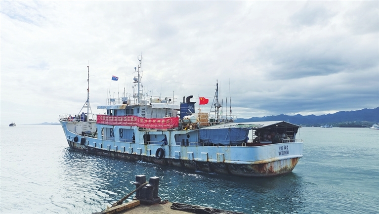 1月24日,运送中国政府援助物资的中水集团公司渔船从斐济苏瓦起航。中国政府援助汤加救灾物资24日从斐济首都苏瓦的渔船码头启运。 新华社 发