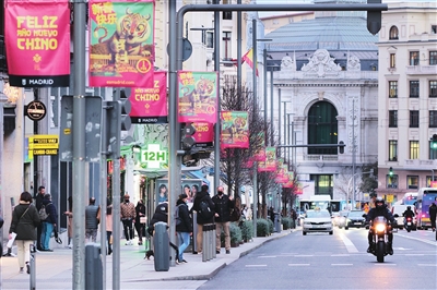 西班牙马德里市政府每年都会邀请艺术家设计一款生肖海报,用以装饰街道,迎接中国春节。 新华社 发