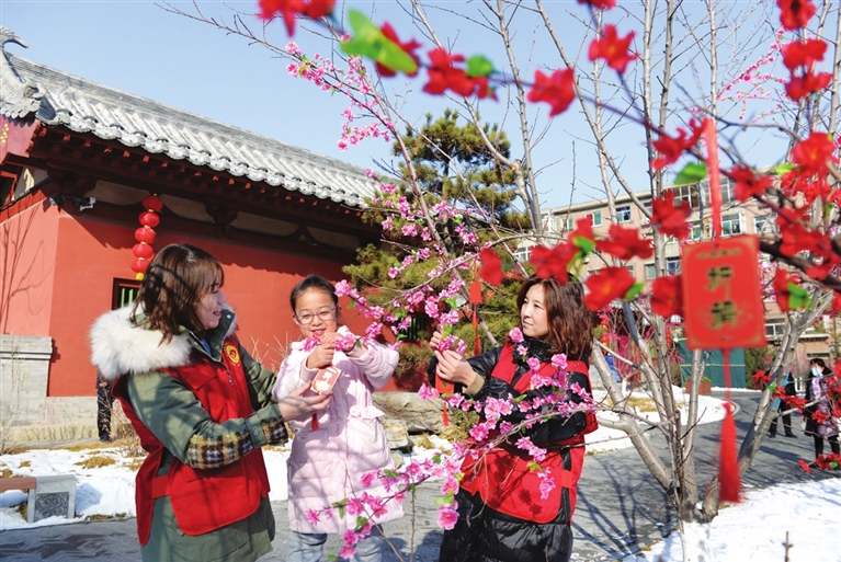 1月25日,狄仁杰文化公园开展送祝福活动。工作人员与游客一起挂灯笼、制作祈福牌,营造出喜庆祥和的浓浓年味。 记者 牛利敏 摄