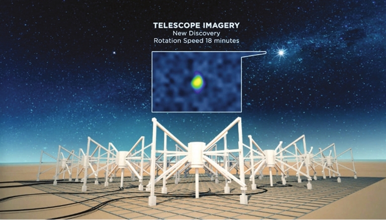 中国科学院上海天文台科研人员张翔与澳大利亚合作者、科廷大学国际射电天文研究中心(ICRAR-Curtin)的Hurley-Walker博士等中外科研人员,通过分析MWA的巡天观测数据,意外地发现一颗位于银河系内具有超强磁场的新天体——一个具有异常缓慢周期性辐射的射电暂现源。