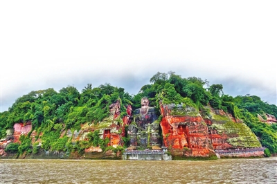 岷江、青衣江和大渡河三江汇流处,凌云山峰峦峭壁之间,一尊通高71米的弥勒石佛坐像雕凿其中。