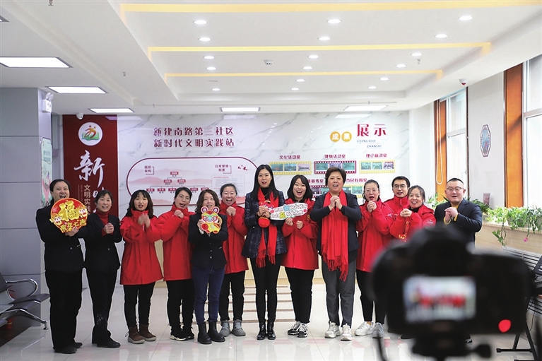 1月27日,老军营街道新南三社区组织全体工作人员录制视频,给辖区居民送上新春的祝福。 张昊宇 高艳梅 摄