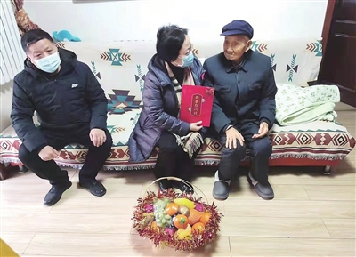 1月28日,市委老干部局工作人员来到百岁老红军杨焕炳家中,送去诚挚的节日问候和美好的新春祝福,祝愿老人健康长寿,生活幸福。 李晓琳 王振枝 摄