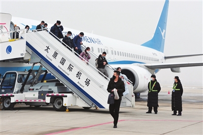 2月7日,太原武宿国际机场迎来返程高峰。图为旅客正在有序出港。 李学军 牛利敏 摄