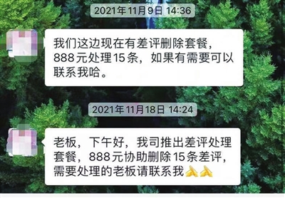 除了可以花钱刷好评,还可以付费删差评。武汉一家餐厅经营者李先生告诉记者,开业不久就有机构找上门来,表示可以帮助删除差评,“订购888元套餐,可以帮助处理15条差评。”