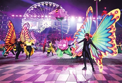 这是2月12日在法国南部城市尼斯拍摄的狂欢节花车夜间游行现场。