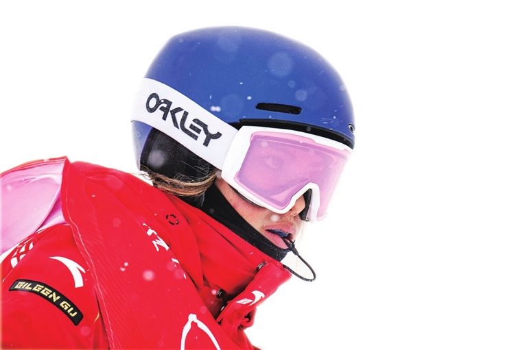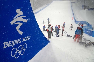工作人员和各参赛队教练在云顶滑雪公园清扫赛场。