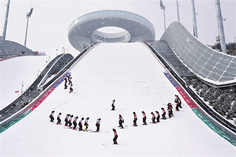 国家跳台滑雪中心赛场内,工作人员在整理赛道。