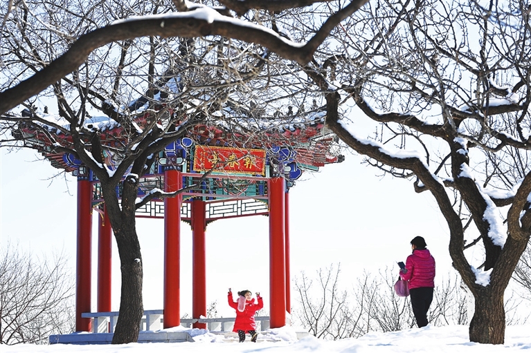 2月14日,游客在北京西山国家森林公园报春亭赏雪。