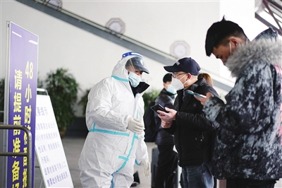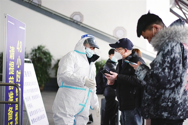 2月16日,在苏州站,工作人员在对进站旅客查验48小时内核酸检测阴性证明等。 当前,江苏苏州正处在抗击疫情关键时刻,疫情防控措施进一步升级。通过开展核酸检测,加快流调溯源和分析研判,全面开展重点人员排查,严格做好密接、次密接及各类重点人群健康管控以及实施离城通道管控等措施,当地政府和广大群众并肩携手,争分夺秒,尽快切断传播链,遏制疫情内部扩散和外溢,努力在最短时间内扑灭疫情。 新华社发