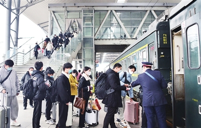 2月16日,旅客在安徽阜阳火车站检票上车。