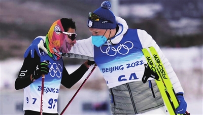 每一个拼尽全力完赛的选手都值得被鼓励。 2月11日,冬奥会越野滑雪男子15公里(传统技术)比赛中,芬兰选手伊沃·尼斯卡宁(64号)夺得冠军后,等待最后排位最后一名的哥伦比亚选手卡洛斯·安德烈斯·昆塔纳冲过终点线时,主动上前送上拥抱。