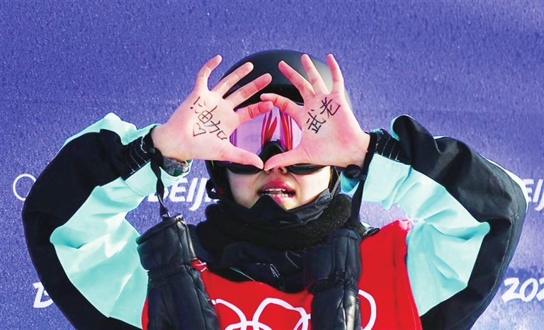 四朵金花,缺一不可。 2月10日,单板滑雪女子U型场地技巧决赛第一个亮相的选手是邱冷,滑完首轮后,她脱掉了手套,对着转播镜头举起双手手掌,上面写着“老武,加油”,这是她对中国队唯一没有进入决赛的队友武绍桐的鼓劲。