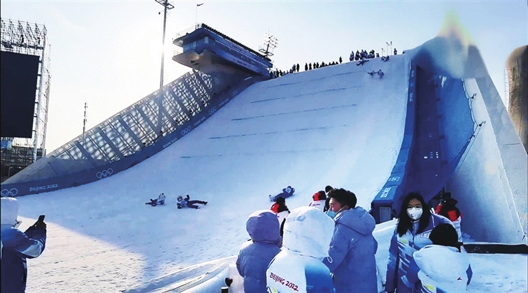 中外工作人员从首钢大跳台上“躺平式”滑下庆祝