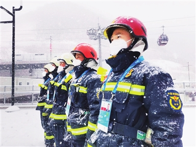 为能及时发现消除火灾隐患,国家高山滑雪安保团队按照场馆网格划分力量,开展消防安全巡查巡视和应急处置。从入驻的第一天开始,前置执勤的指战员每天背负着添加了防冻液的细水雾灭火装备,或是风力灭火机,每日负重20多斤,从海拔2198米的“雪飞燕”到海拔1238米的集散广场,行走约两万余步,像“守山人”一样,踏遍场馆每一个角落,用脚步丈量场馆每一寸的消防安全。