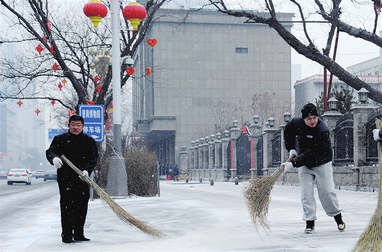 2月17日,我市迎来春雪。府东街上,人们纷纷自发及时清扫门前积雪。 徐浩轩 摄