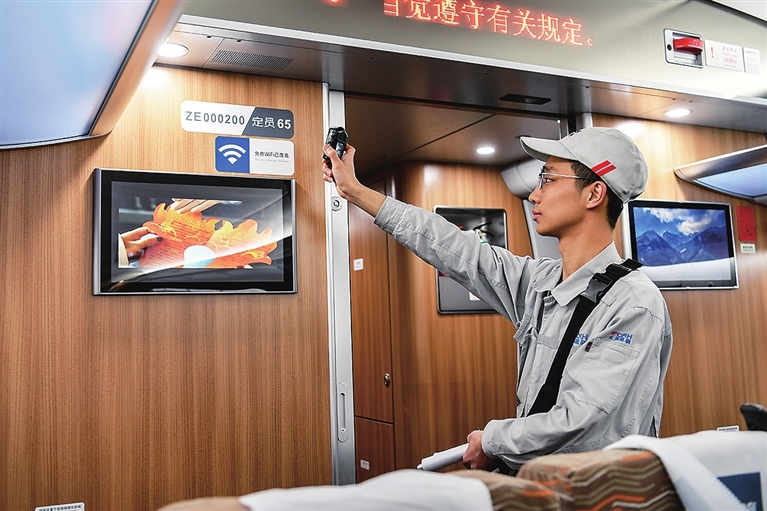 为防止夜间动车组列车内部的复杂管路被冻坏,中国铁路太原局集团有限公司太原车辆段组建的“打温队”,每天为不同车型的70余列动车组提供“打温服务”。升弓供电、巡检车厢、拍照记录……“打温人”穿梭在一节节车厢之间,保障车内设备处于良好状态,守护旅客出行安全。 新华社 发