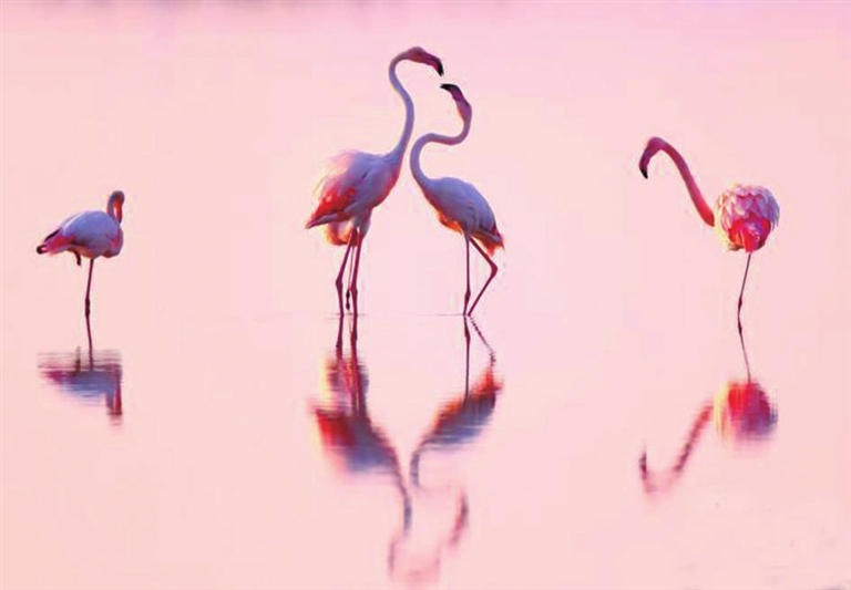火烈鸟亦称红鹳,主要分布在印度、非洲和中南美洲,栖息于温热带盐湖水滨,以小虾、蛤蜊、昆虫、藻类等为食。