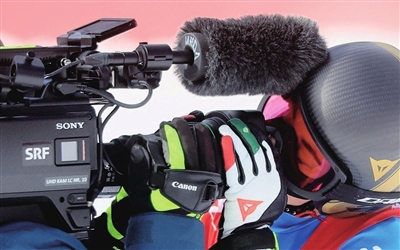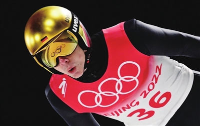 | 2月12日,跳台滑雪男子个人大跳台,一名选手的眼镜中倒映出五环标志。 |