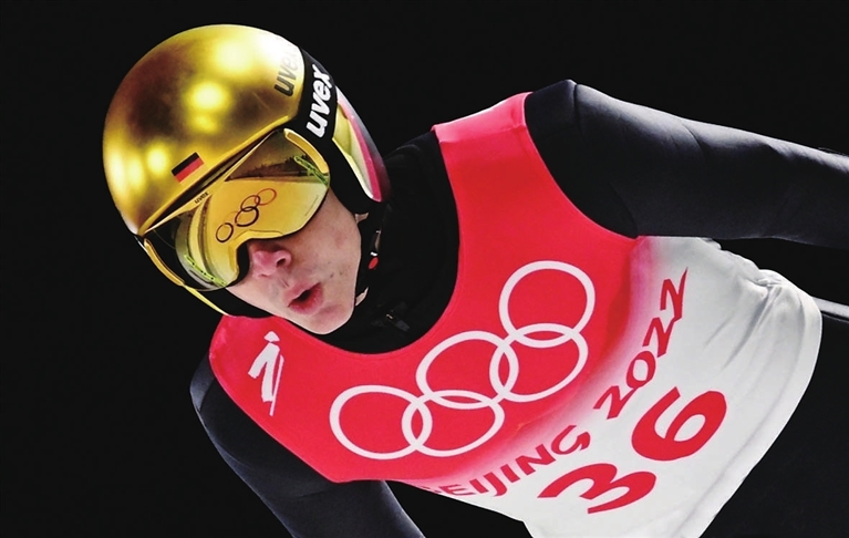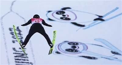 | 2月15日,北欧两项比赛场中,藏着两只滑雪的冰墩墩,只有运动员高高跃起时才能看到。 |