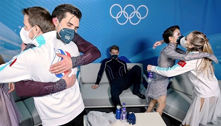 | 2月14日,冬奥会冰舞比赛结束后,美国选手与俄罗斯选手相拥庆祝。 |