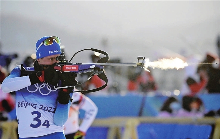 | 2月5日,在冬季两项混合4x6公里(W+M)接力比赛中,法国选手射击时子弹出膛的瞬间。 |