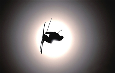 2月11日,一名运动员在云顶雪公园进行自由式滑雪障碍技巧训练,摄影师捕捉到他在阳光里的剪影。 |