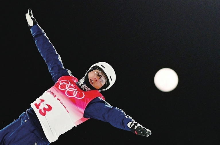 2月15日,自由式滑雪男子空中技巧资格赛,乌克兰选手阿布拉门科腾空时与元宵节的月亮同框。 |
