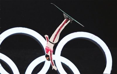 2月10日,加拿大选手刘易斯·欧文在混合团体空中技巧决赛时,空中姿态与五环弧度相贴合。 |