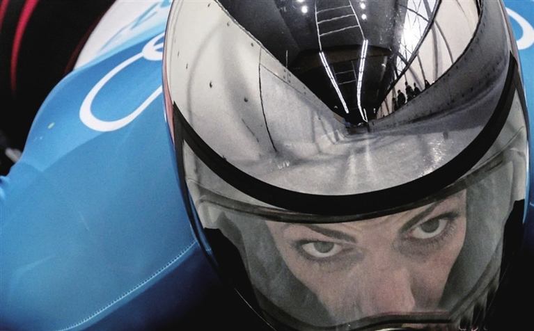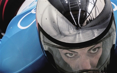 2月11日,女子钢架雪车比赛时,奥地利选手珍妮·弗洛克的头盔设计巧妙,可以反射出前方的赛道。 |