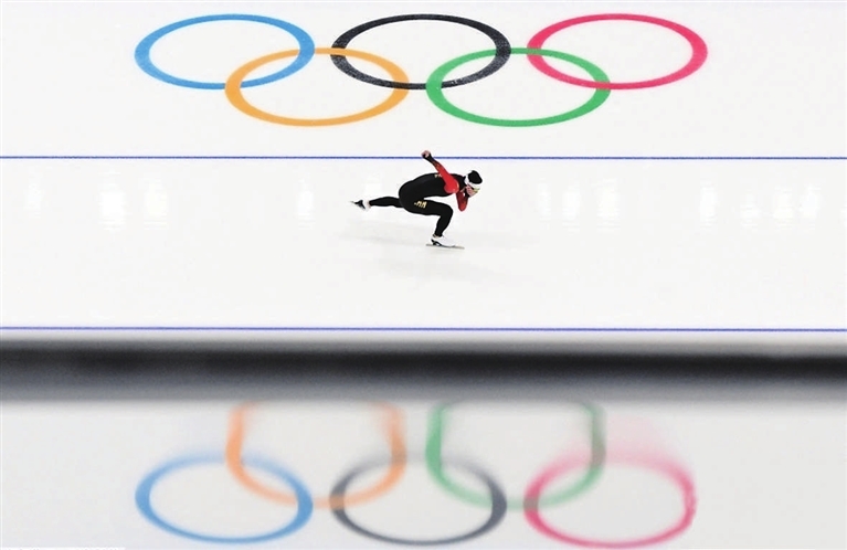 2月13日,一名中国运动员在冬奥会速度滑冰比赛前热身,从两个五环标志中穿过。 本版图片均据中新社 |