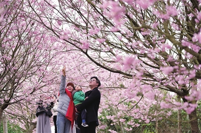 2月18日,游人在重庆市北碚区澄江镇五一村欣赏盛开的樱花。