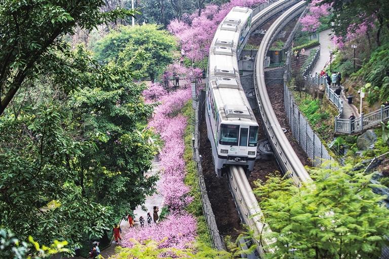 2月20日,重庆轨道二号线列车从花丛中穿过。