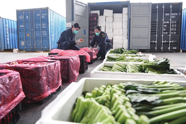 2月21日,在深圳大铲湾码头,深圳海关工作人员查验供港蔬菜。