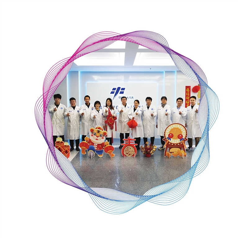 2 图为1月30日,在航天科技集团五院在轨航天器支持中心数字空间站外,空间站任务飞控试验队科研人员合影留念。