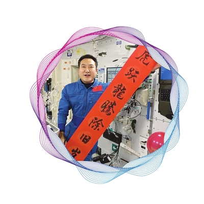 1 图为2022年1月31日正值除夕,神舟十三号航天员在遥远的太空专门发来视频,向祖国和人民送上祝福。这是指令长翟志刚拿着春联送上祝福(视频截图)。