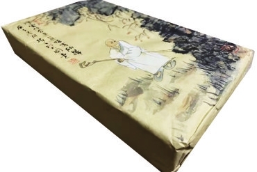 这些画,画的都是山水,笔是笔,墨是墨,款是款,印是印,一丝不苟,尺幅虽小,却呈高远之势。点缀一二人物,非为老僧,即是古贤,多著白衣,或行或止,皆具神采。人与山水相衬,满纸见生机。只是这纸少见,问过之后才知是茶衣。何谓茶衣?即茶砖之外包装也。茶衣之名是我随意取用,书之包皮称书衣,茶之包装称茶衣不也好?见过茶衣上印画的,没见过茶衣上留真迹的,拓之算一个,即便另有,怕也没有他这么多。