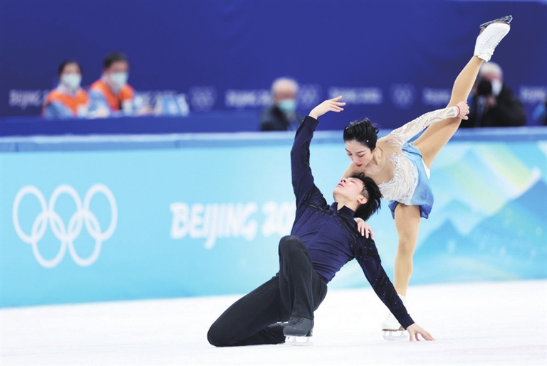 在结束的花样滑冰双人滑自由滑比赛中,中国队选手隋文静、韩聪的“葱桶组合”表现堪称绝美,一举摘得金牌,这是我国在本届冬奥会上取得的第九块金牌。