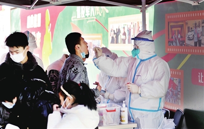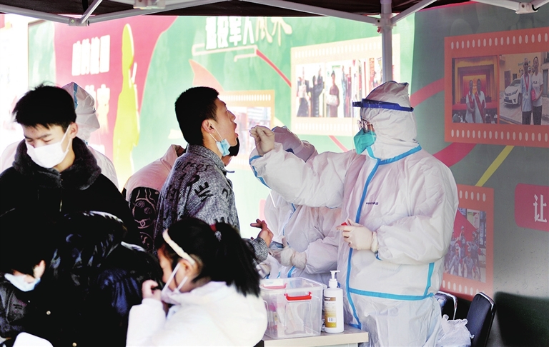 2月26日,我市尖草坪区开展全员核酸检测。汇丰街道槐园社区内,居民们正在排队接受核酸检测。 徐浩轩 摄