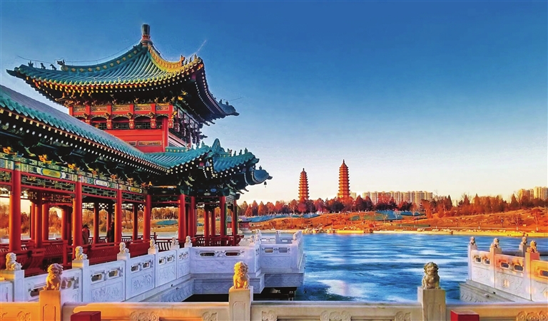 和风送暖,大地回春。2月27日,夕阳下的双塔缀满了霓彩,在融冰的映衬下,为早春的太原送来了别样风情。 记者 宿晓健 摄
