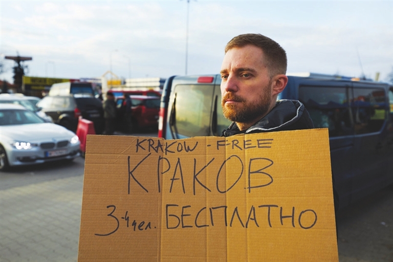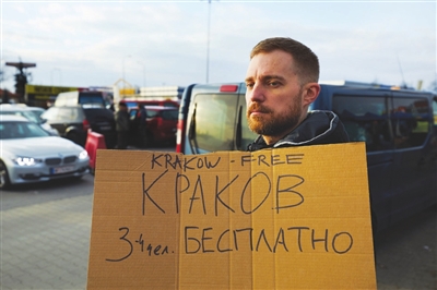 “我有两辆车,有一辆已经满了,另一辆还可以载4人!”一个不愿透露姓名的中年男子说。他举着一块纸板,上面用乌克兰语写着“布拉格”。据他介绍,许多人在脸书上看到有慈善组织在召集志愿者司机来帮助逃难的乌克兰人,于是大家就自行驱车来帮忙。