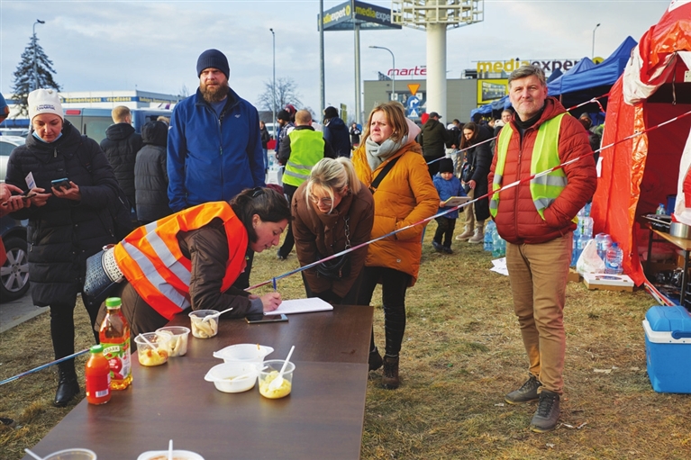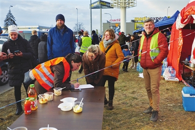 新华社记者26日驱车从华沙赶往波乌边境,看到普热梅西尔市中心通往边境的主干道旁,一个大型购物区的停车场上临时搭建起十多顶蓝色大帐篷。帐篷里面,来自波兰各地的志愿者不断向到来的乌克兰人提供各种生活必需品,包括饼干、方便面、矿泉水、厕纸和婴儿纸尿布等,还有各种紧急筹集来的衣物。