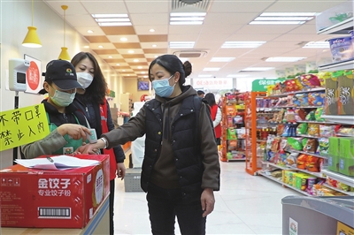 2月28日,在望景路某便利店入口处,滨河社区网格员与便利店工作人员一起对进店的消费者进行实名登记,体温检测,做好疫情防控。 张昊宇 摄