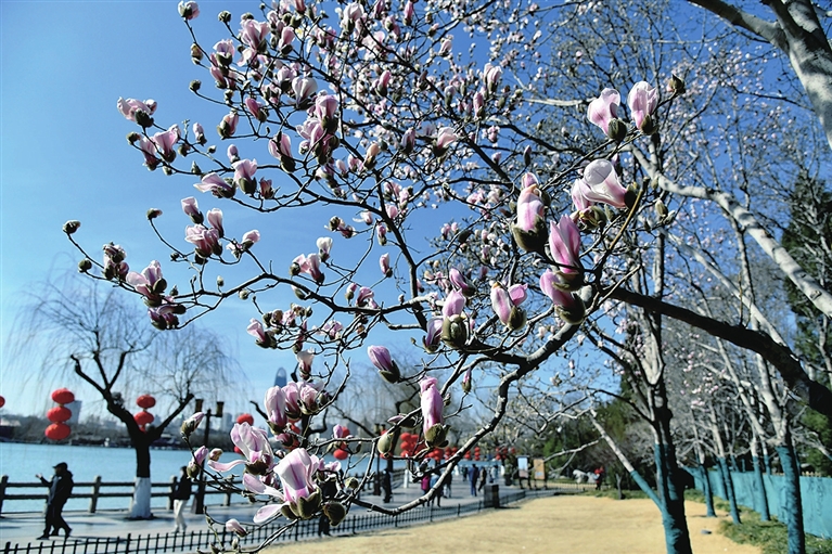 3月1日,济南市大明湖景区湖畔的玉兰花绽放。