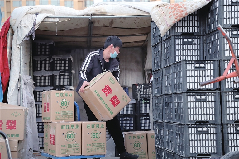 3月5日,万柏林区河西农副产品批发市场内,商户正在搬运刚刚到货的贡梨。当日是24节气中的惊蛰,梨子销售进入旺季。 张昊宇 摄