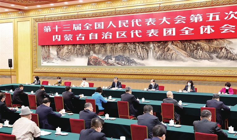 内蒙古代表团审议热烈,气氛活跃。张磊、郭艳玲、贾润安、王晓红、冯艳丽、赵会杰、史玉东等7位代表分别就完整准确全面贯彻新发展理念、加强草原生态建设、煤化工产业助力实现碳达峰碳中和、将铸牢中华民族共同体意识融入办学治校教书育人全过程、为实现高质量发展贡献航天力量、推进乡村振兴、振兴民族奶业等问题发言。习近平不时插话并记录。