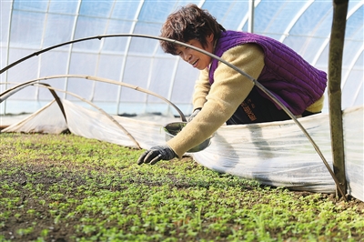 3月2日,在太原市晋源区花村——古城营村新建的日光温室大棚里,一垄垄翠绿铺就开来,有西芹、茴子白、菠菜、生菜,一派春意盎然。村民杜卫龙在外侧的大棚里整地,妻子则在里侧的大棚里为花苗除草。