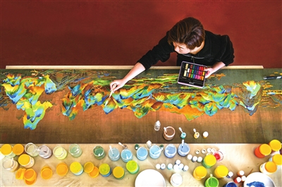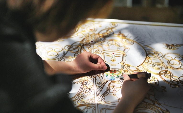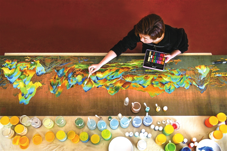 拓图、掐丝、点蓝、覆膜,是金丝珐琅画的主要制作工序。其中,点蓝最为出彩。以石英、长石、硼砂等天然矿物为原料,经高温烧制、研磨,形成细如沙粒的色粉后与胶调和。以吸管为笔,细沙为色,填入金丝掐成的轮廓里。就在这掐丝为线、堆沙成画的坚持中,一幅幅作品有了生命。